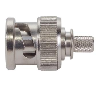 Dual crimp, single, BNC connector plug for use with RG 58, RG 58A, RG 58B, RG 58C coaxial cable.